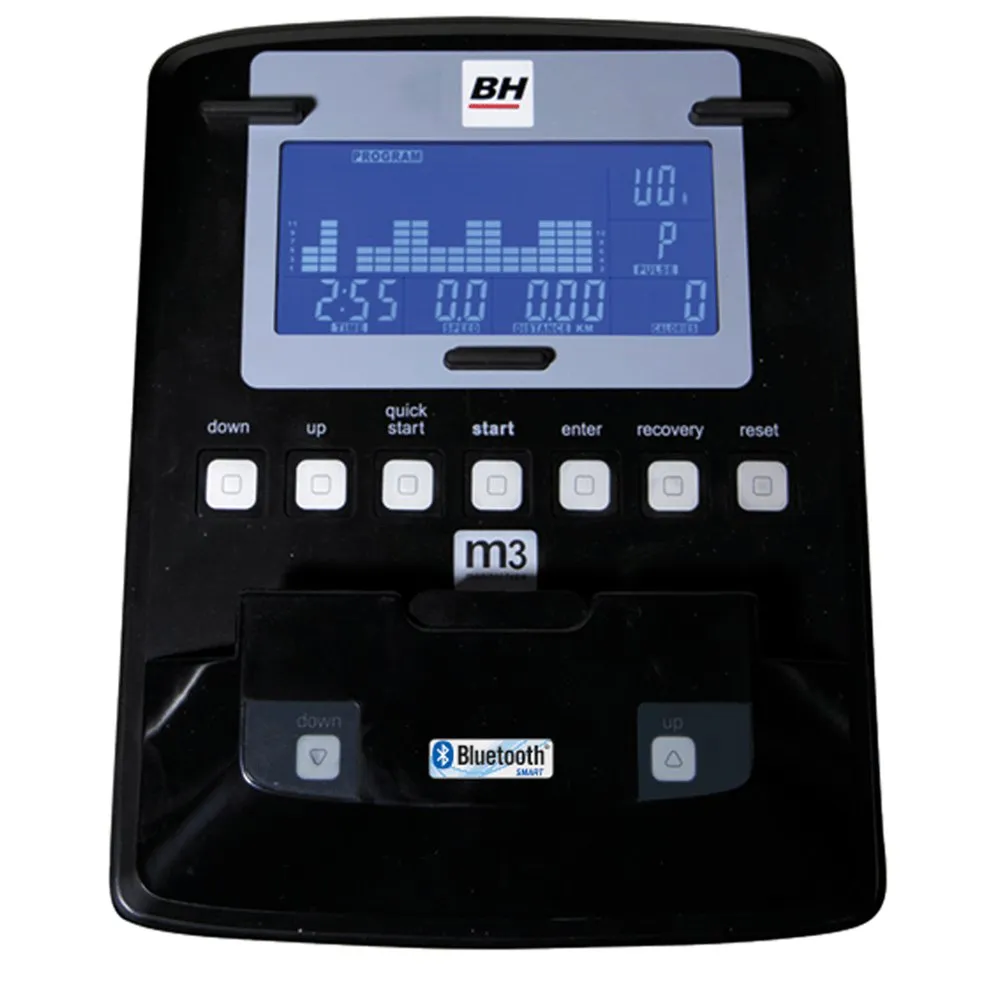 Blue backlit LCD console with 12 different workout profiles and 24 intensity levels.