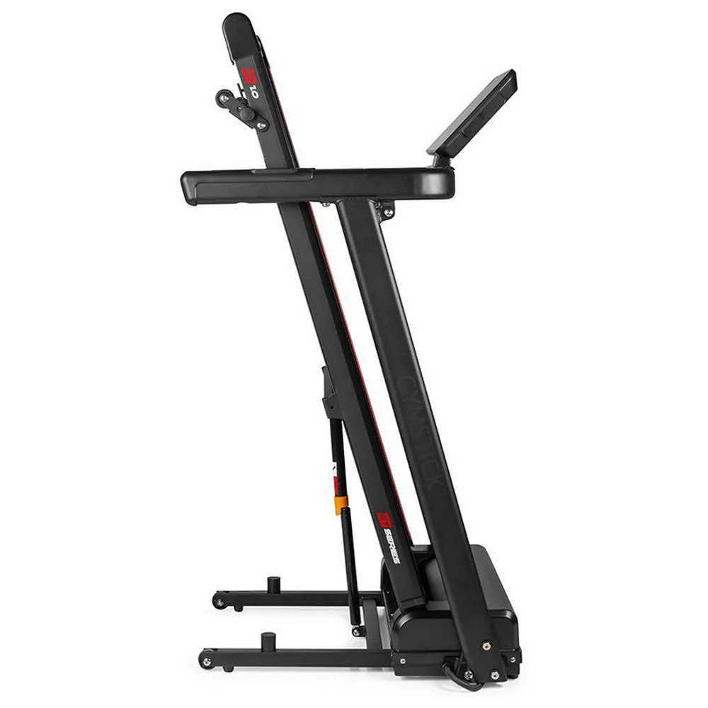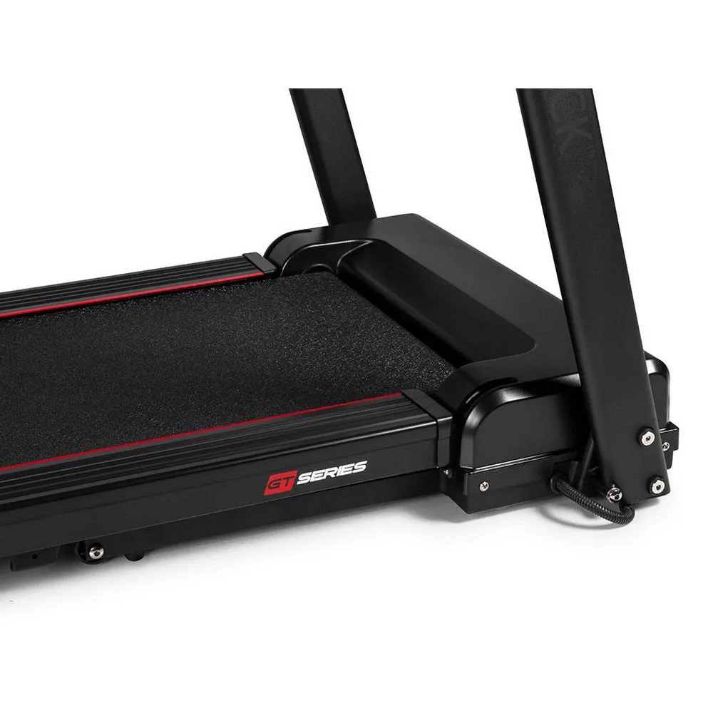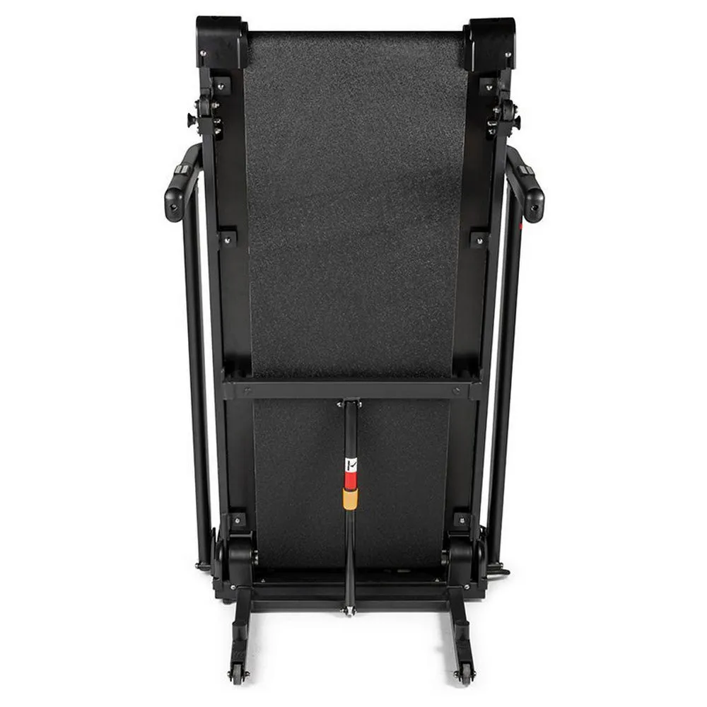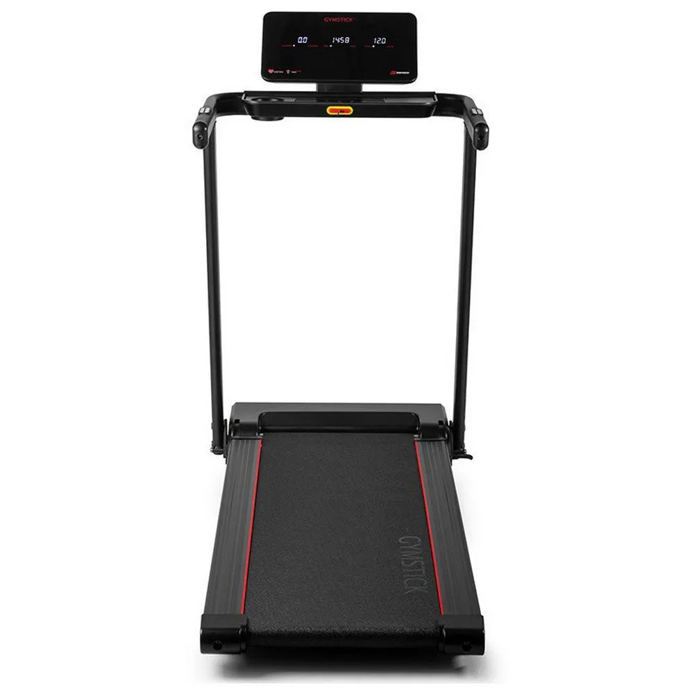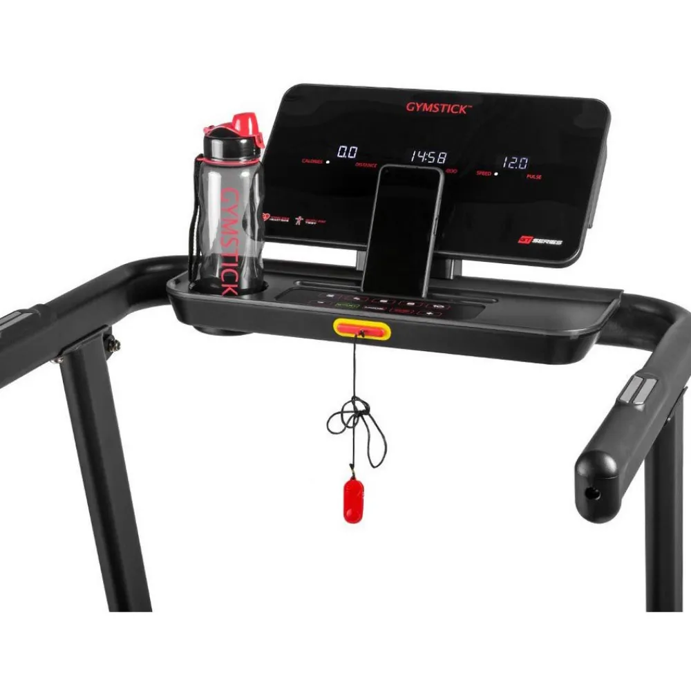 Gymstick GT1.0 Treadmill offers a pleasant running experience and various features for efficient training in a compact form-factor. Running speed can be easily adjusted with quick hotkeys on the console. The stylish LED-screen shows you all your important running data. The running belt gives in a little while running, lowering the risk of injury to the body and ligaments. Sturdy body, extending handlebars and a safety line ensures that running on the GT1.0 is as safe as possible. The running belt can also be adjusted from a perfectly flat surface to a small upright angle manually using the adjuster at the back of the device. The treadmill can also be easily folded upright to save space after training.