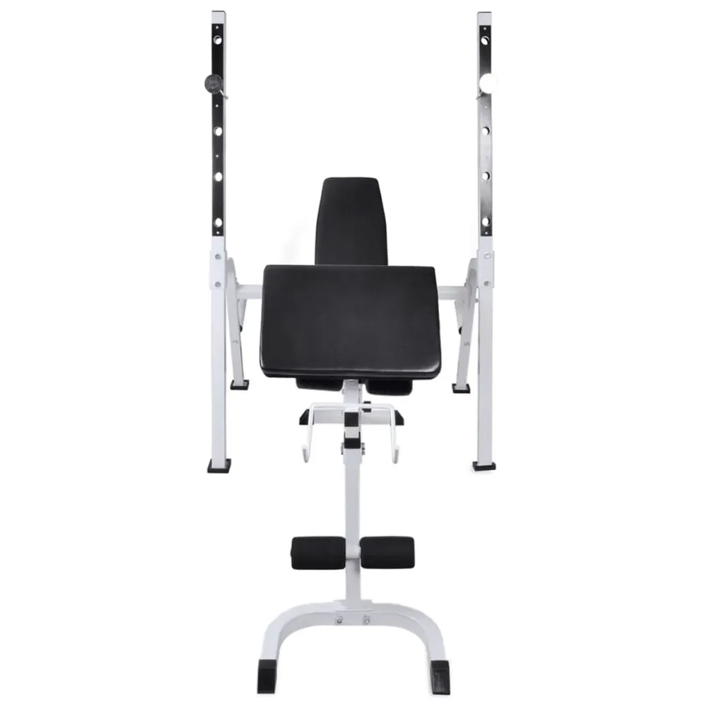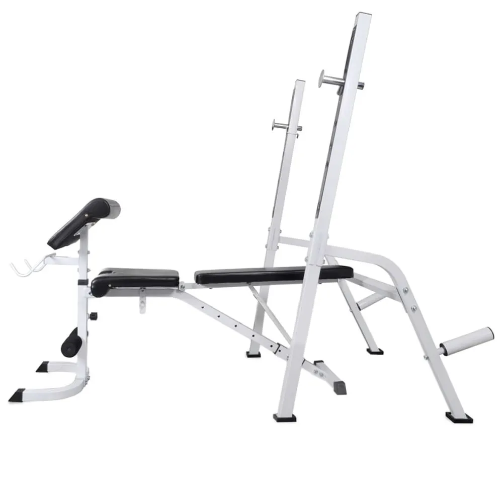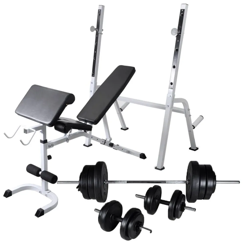 This adjustable workout bench with a weight rack and barbell and dumbbell set will be a great choice for working out in the comfort of your own home, and saves you the hassle and expense of going to a gym. This workout bench provides a wide range of exercise options. The backrest will strengthen your back muscles. Thanks to the arm curl cushion, arms can be exercised. The wide range of workout combinations and exercises allows for an effective, total body workout, while the adjustable levels enable the workout to be adapted to suit your specific needs. The sturdy steel construction of the bench ensures your safety during the exercises. The durable cotton-padded cushion will offer you the utmost comfort. The barbell and dumbbell set features solid chrome-plated bars with quick-action spring collars (for barbell bar), non-slip knurled grips, and fluted star-screw caps (for dumbbell bars) for secure attachment of the weight plates. You can work out without worrying about safety issues. The weight plates are made with a robust polyethylene casing. They can be combined in various ways for different training purposes. Delivery includes a workout bench, a barbell bar, two dumbbell bars, six 1,25 kg weight plates, four 2,5 kg weight plates, four 5 kg weight plates, two 10 kg weight plates, four caps and two spring collars. Workout bench: Material: Steel Dimensions: 150 x 45 x 123 cm (L x W x H) Rack dimensions: 73 x 105 x 150 cm (L x W x H) Backrest dimensions: 71 x 24 x 4 cm (L x W x T) Seat dimensions: 38 x (24-31) x 4 cm (L x W x T) Arm curl cushion dimensions: 44 x 28 x 4 cm (L x W x T) Maximum user weight: 100 kg Backrest height adjustable in 7 settings: Minimum 19 cm, maximum 123 cm Seat height adjustable in 4 settings: Minimum 52 cm, maximum 65 cm Bar support adjustable in 5 levels: Minimum 78 cm, maximum 138 cm Arm curl cushion height adjustable in 7 settings: Minimum 80 cm, maximum 98 cm Barbell and dumbbell set: Weight plates with polyethylene casing Grip size: approximately 14,5 cm (barbell), 10 cm (dumbbell) 1 x 2 kg barbell bar: 2,5 x 140 cm (Diameter x L) 2 x 0,5 kg dumbbell bar: 2,5 x 45 cm (Diameter x L) 6 x 1,25 kg weight plate: 17,5 x 3 cm (Diameter x T) 4 x 2,5 kg weight plate: 22 x 4 cm (Diameter x T) 4 x 5 kg weight plate: 27 x 4,5 cm (Diameter x T) 2 x 10 kg weight plate: 32 x 5,5 cm (Diameter x T) 4 x Cap 2 x Spring collar Total weight including bars: 60,5 kg Total weight of plates: 57,5 kg