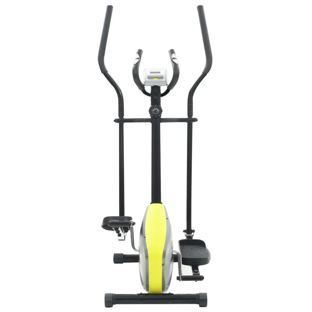 This robust magnetic elliptical trainer will be a great choice for exercising at home. Equipped with a flywheel, 8 manually-controlled intensity settings, and an LCD computer display, this cross trainer is sure to give you an efficient workout. You can monitor your performance on the LCD display, which shows information about the elapsed time, current speed, distance, calories burned, odometer and pulse. The computer display has a tablet holder so you can use your tablet or watch a movie during your workout. The hometrainer is ergonomically designed. Its two handles provide you with sufficient scope for an optimal walking position and offer an extra upper body workout at the same time. The large, non-skid foot pedals ensure an optimal power transfer from your feet to the pedals. The magnetic brake system and precision-balanced flywheel are frictionless for a smooth, quiet, and maintenance-free operation. The transport rollers in the base make it easy to move the fitness bike around. The cardio equippment needs to be assembled. Colour: Grey and yellow Material: Metal and plastic Dimensions: 105 x 59 x 153 cm (L x W x H) Total weight: 23,5 kg Rotating mass: 10 kg Maximum user weight: 100 kg Brake system: Magnet Drive system: Ribbed belt, bidirectional 8 intensity levels, manually controlled With transport rollers in the base Functions of the LCD computer: Scan, time, speed, distance, calories, odometer, pulse With 2 AAA batteries Easy assembly
