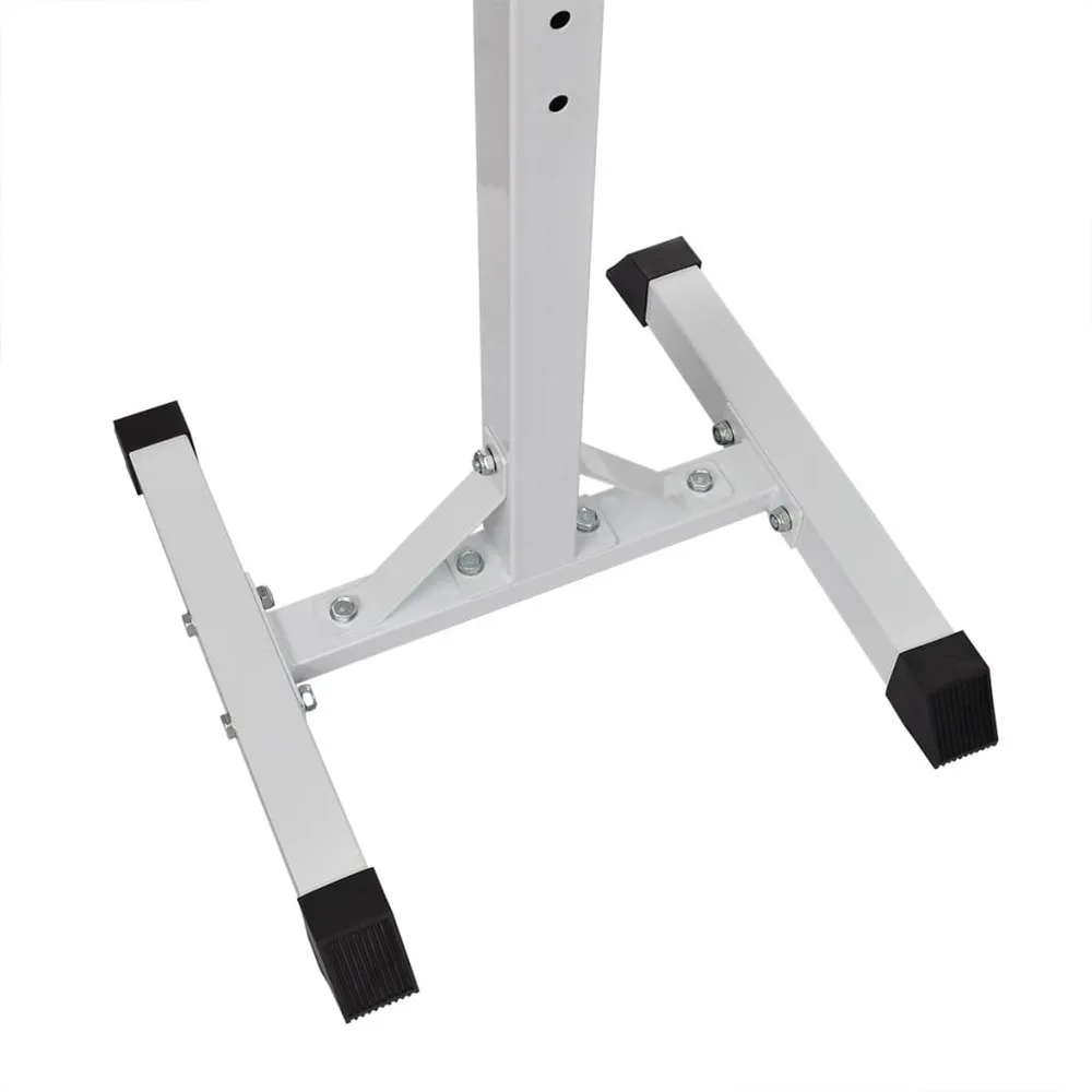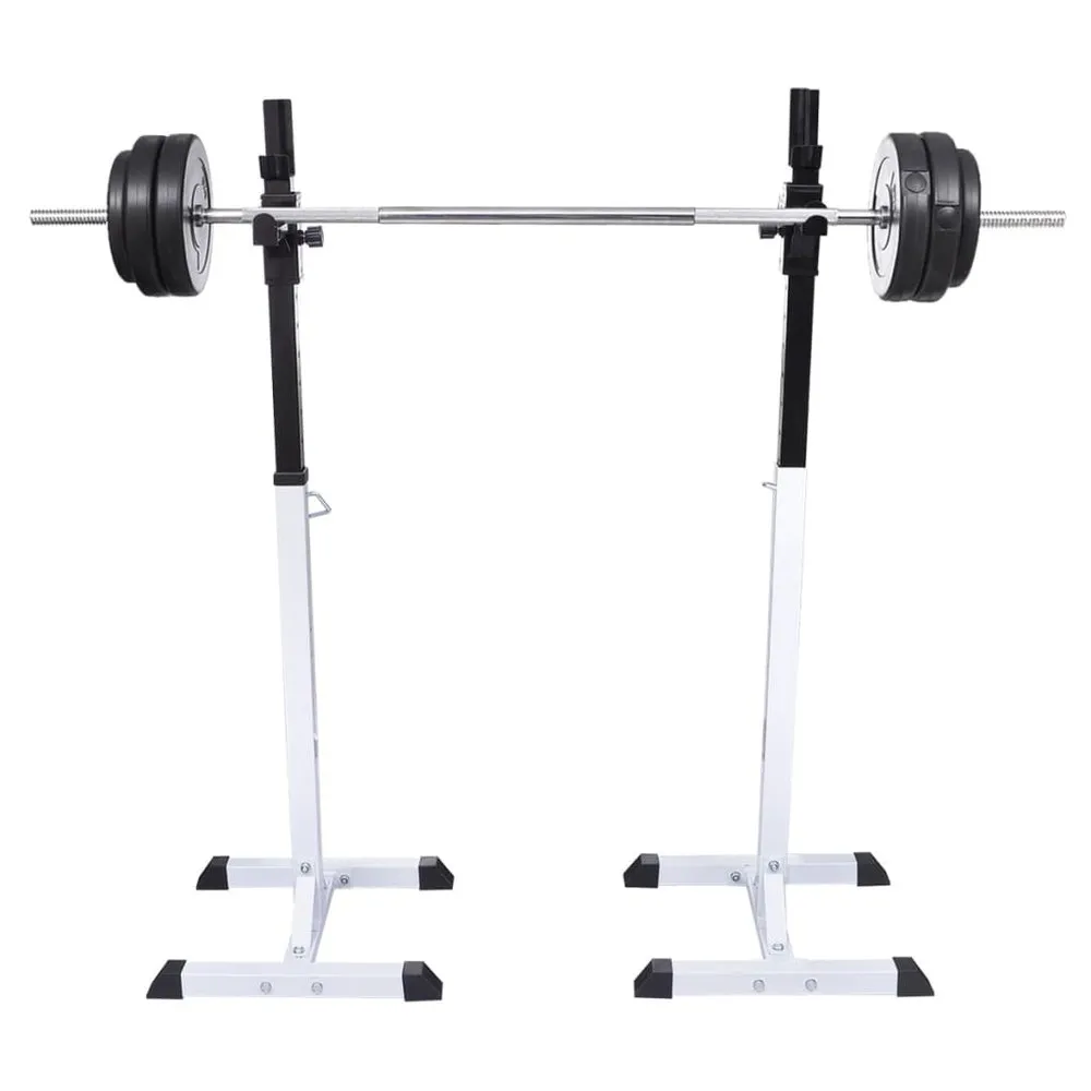 This robust and stable barbell rack set is perfect for your own home gym! In combination with a barbell bench, it will be suitable for barbell training, squats or as a supplement to a barbell bench. The barbell rack holder comes with the features like: Stable barbell rack for barbells with a diameter of about 45mm and 50mm Rugged Steel construction with a max load of: 80 kg Height adjustable and suitable for almost any body size and various exercises. Compact and space saving! Very stable and non-slip legs Suitable for beginners through to advanced athletes 12 adjustable levels in total Net Weight: 15,5 kg, slightly in the transport Please note that the barbell in the picture is not included in the delivery. Colour: White / Black Material: Steel Dimensions: 50 cm x 48 cm x 107 – 165 cm (L x W x H) Adjustable Levels: 12 levels, Min. 107 cm Max. 165 cm Max. Bar Support Weight: 80 kg Main Tube: 50 x 50 x 1,5 mm Net Weight: 15,5 kg